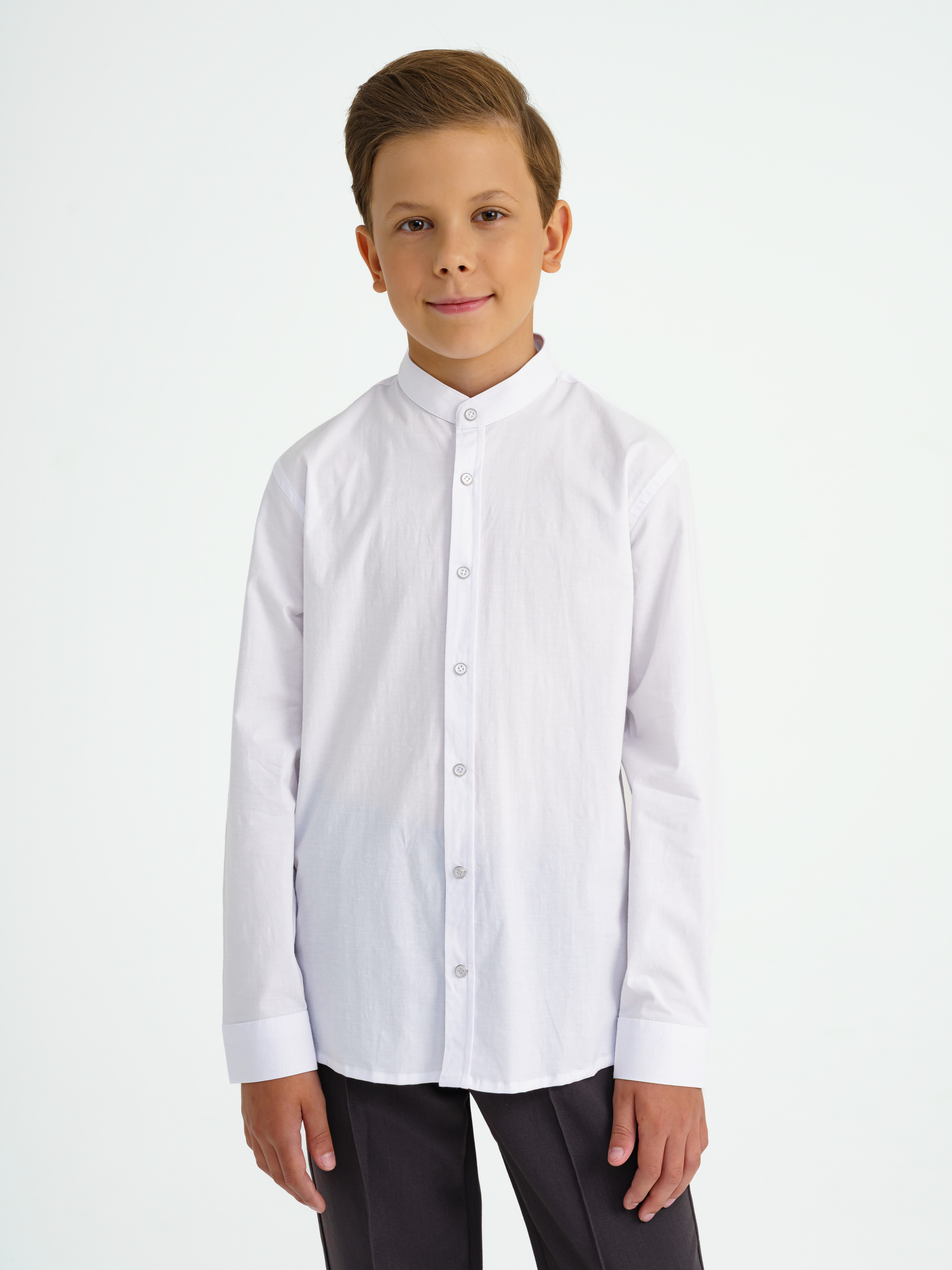 Рубашка для мальчика на кнопках с длинным рукавом и воротником стойкой. Классическая школьная рубашка прямого покроя.